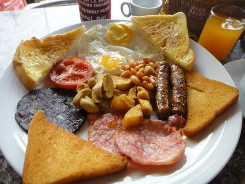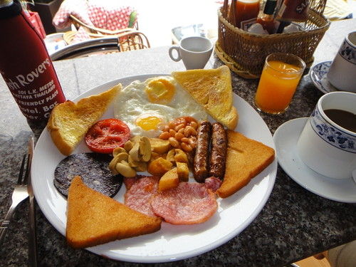 卵2個、ソーセージ、ベーコン、ハム、ジャガイモ、マッシュルーム、焼きトマト、トースト(マーガリンが塗った状態で来ます)、揚げトースト。