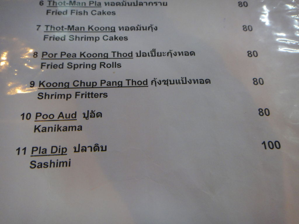 以下、値段は忘れたのですが、大体のお料理は80〜120B(200〜300円)くらいです。食べたことないけど、カオパッなどは50B(約130円)くらいなので、シーフード料理屋さんとしてはかなりリーズナブルな部類。