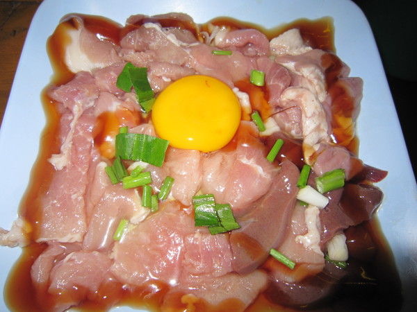 肉の上にのっている卵は、肉にからめてから鍋に投入するのが一般的です。